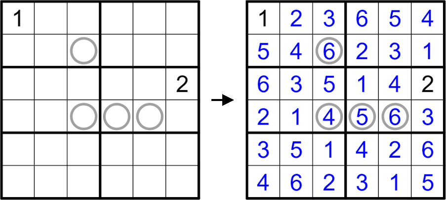 Es gelten die normalen Sudoku-Regeln. Eine Ziffer in einem Feld mit Kreis gibt die Anzahl verschiedener Ziffern im 3x3-Bereich um diese Zelle an (einschließlich der eingekreisten Ziffer selbst).