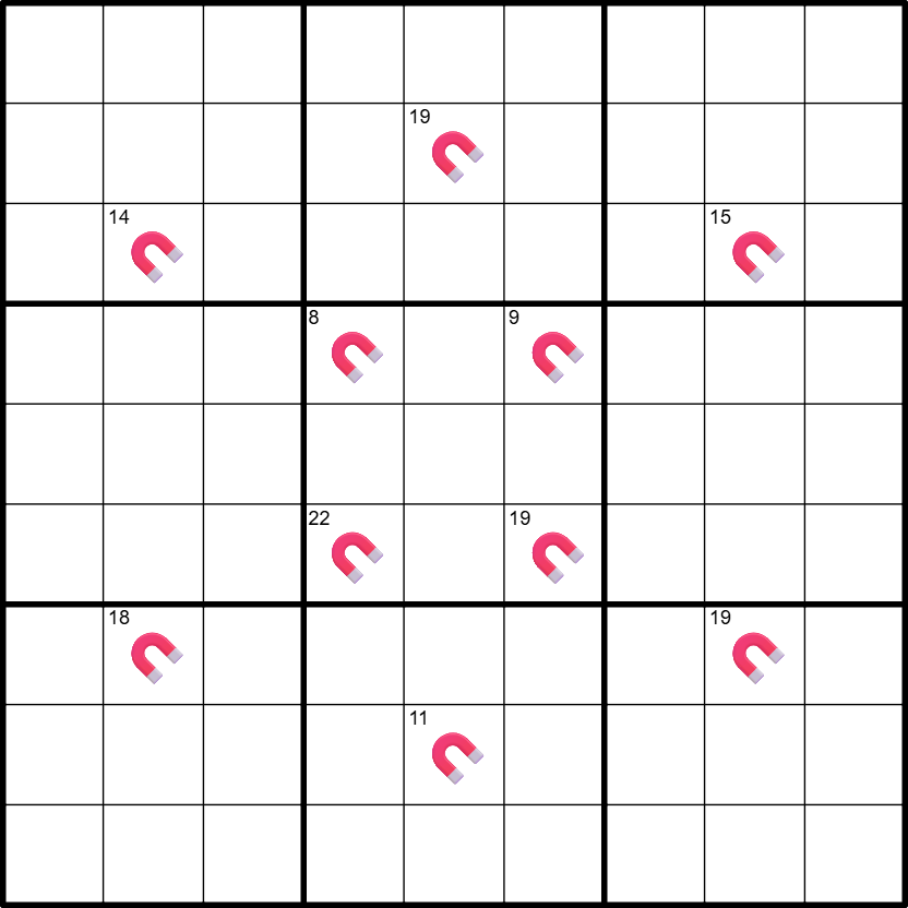 A magnet is a three cell long straight line (orthogonal or diagonal) consisting of a high pole, a low pole, and a central cell marked by a magnet symbol. A high pole must contain a digit from 6-9, A low pole must contain a digit from 1-4, and the central cell may contain any digit. Poles of the same type may not touch each other, even diagonally, but poles of opposite types may. Different magnets may not cross each other or share cells. The three digits on a magnet must sum to the small number in the corner of its central cell and may repeat if allowed by other rules.