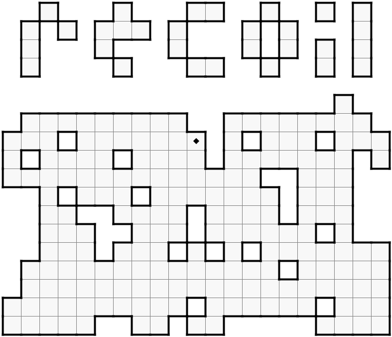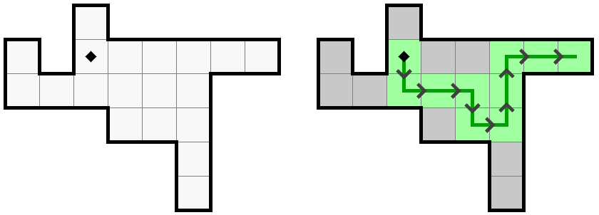 Recoil: Starting at the black diamond, draw a directed path through the centers of some cells in the grid. Path segments are drawn sequentially from cell to cell, such that the first path segment is drawn from the black diamond to an adjacent empty cell, the second segment is drawn from that cell to the next empty cell, and so on until the final segment is drawn and the path ends.