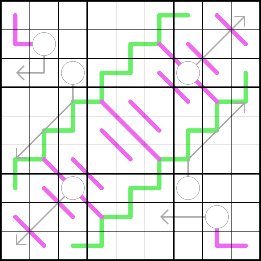 Purple lines contain a non-repeating set of consecutive digits in any order. Furthermore, any N cell purple line repeats at least N times in the completed grid (ignoring digit order).