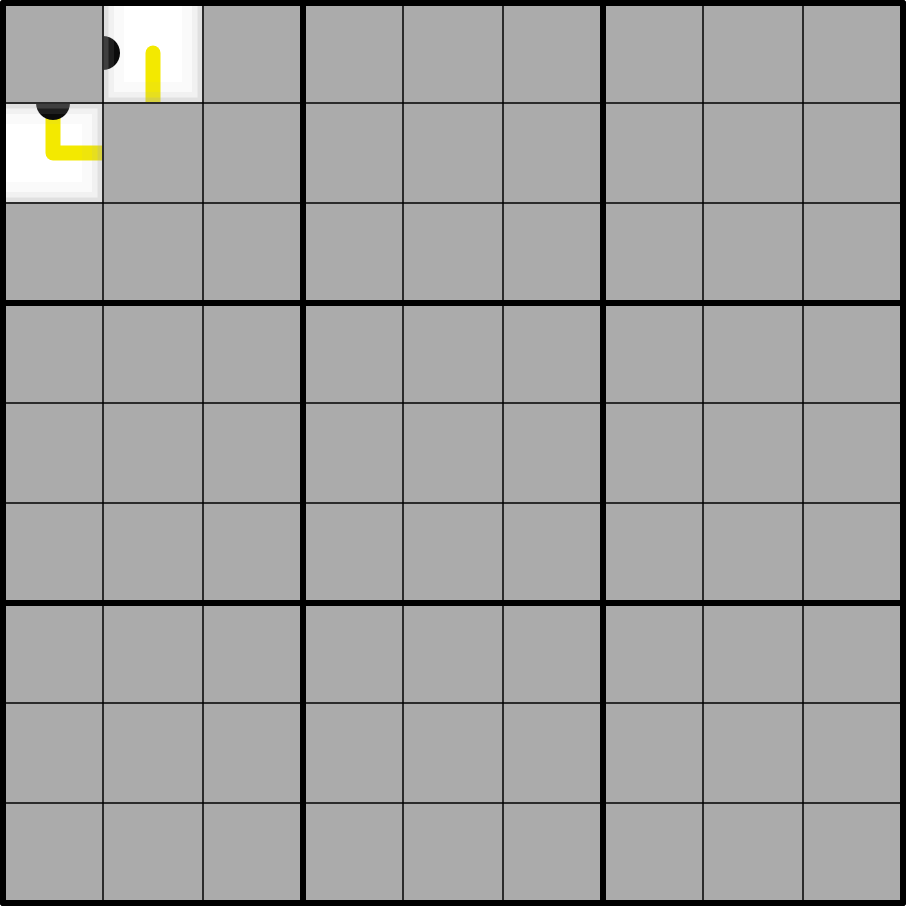 Along yellow Whisper lines, digits must differ from their neighbors by at least X, where X is the digit in the leftmost cell of the topmost row on that line (The leftmost cell in its highest row).