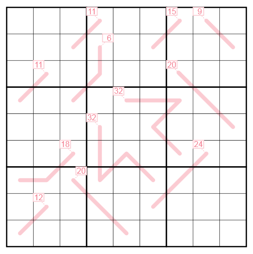 - Killer-Linien: Ziffern auf einer Linie dürfen sich nicht wiederholen und müssen sich zum angehängten Hinweis addieren.