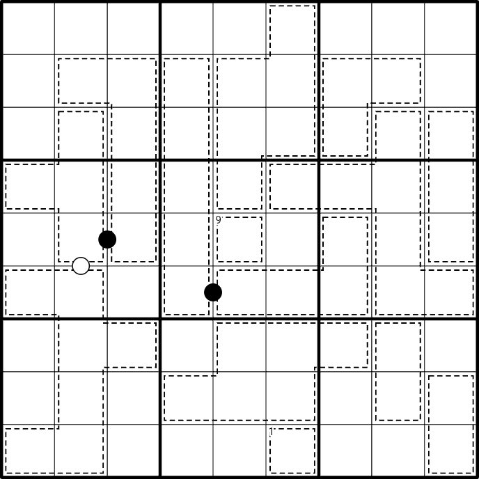 Kropki dots are only placed where they connect cells from two separate cages. Black dots indicate cells with a 2:1 ratio. White dots indicate consecutive digits.
