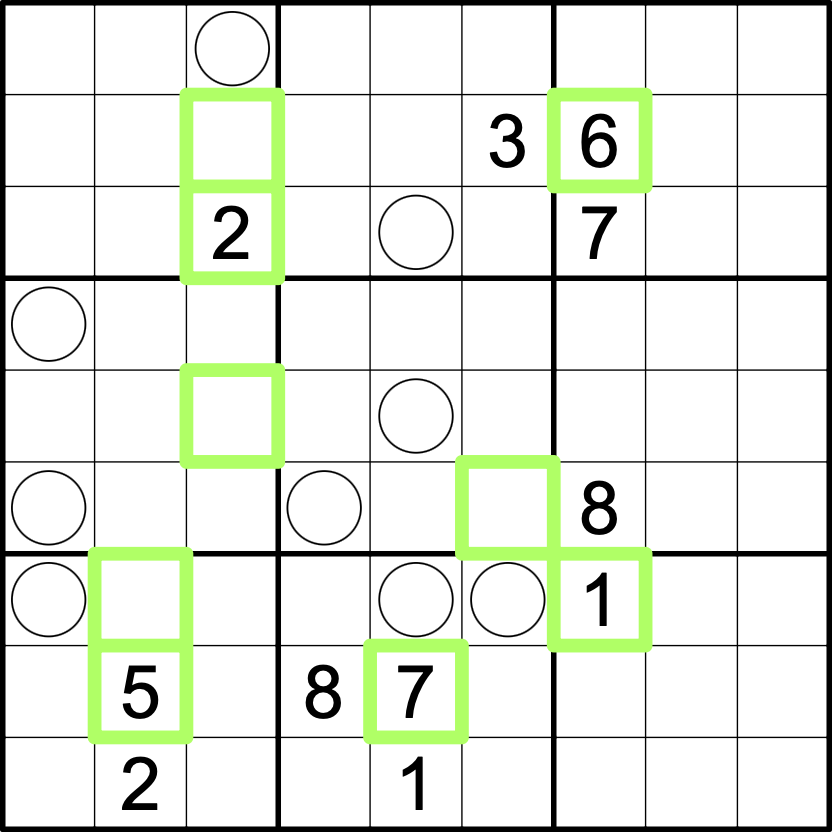 Cells marked with a green square are shooters. A shooter always fires at a target — a cell marked with a circle.