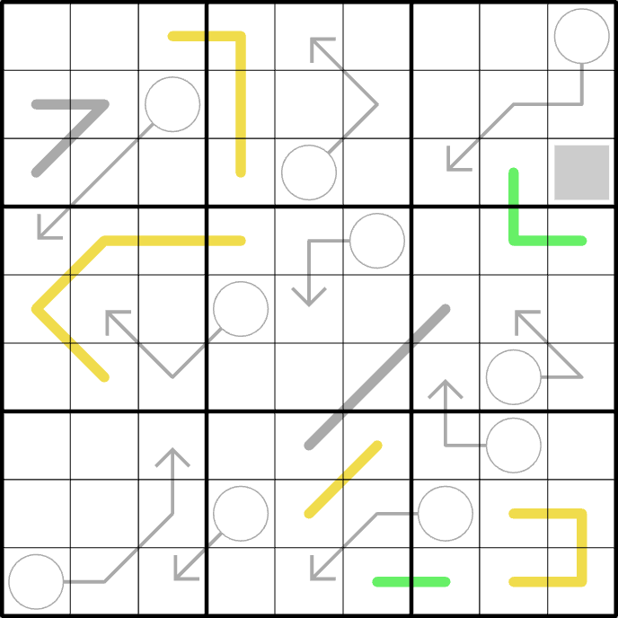 Leave one cell in every row, column, and box empty. These are the missing digits. Cells with clues (Lines, arrows, etc.) must not be empty.