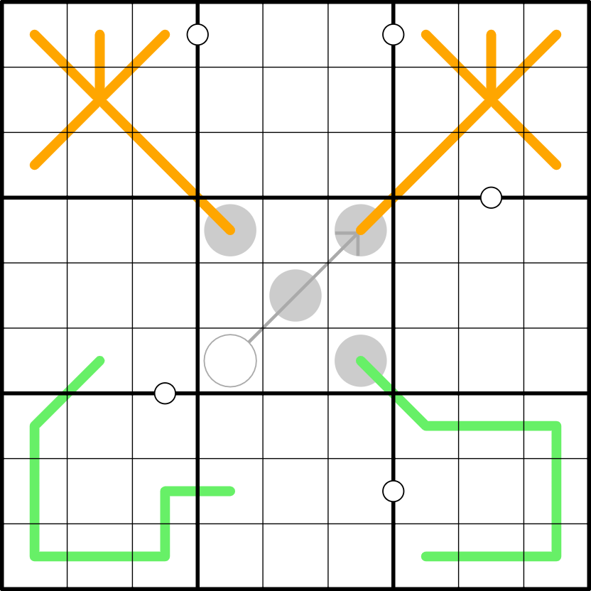 Dutch Whispers: Adjacent digits along orange lines differ by at least 4.