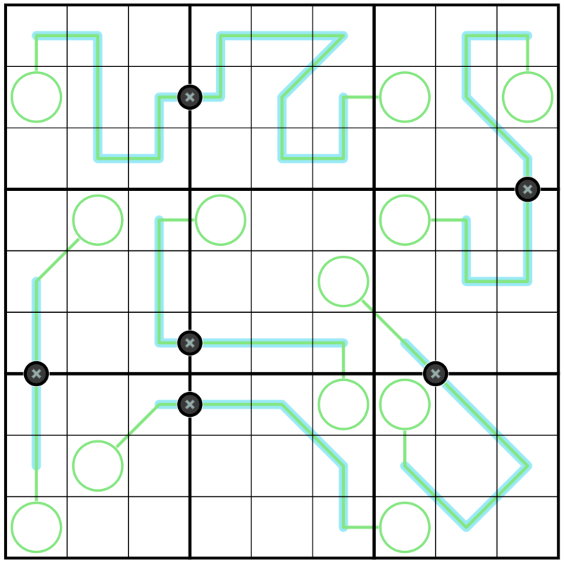 Region Sum Screws (variant): Box borders divide the blue lines into segments. Segments with a black screw between them have a n:1 ratio, i.e. one of the segments sums to n times the other, where n is an integer (to be determined by the solver). No two black screws may have identical ratios.