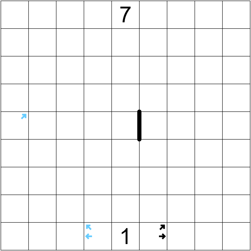 - Arrows: cell contains arrow(s) may not be shaded. Either there are exactly two dominoes in the direction of each blue arrow and exactly one domino in the direction of each black arrow, or vice versa(blues see one, blacks see two). There must be a region border in the middle of each domino pointed by arrow.