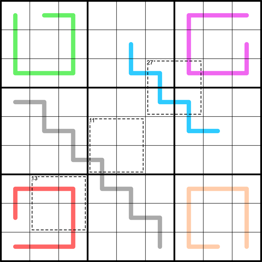 Region Sum Lines: Digits on a blue line have the same sum in each box the line is in.