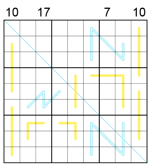 - Up to N-Summen: Ein Hinweis außerhalb von Reihe oder Spalte N gibt die Summe aller Ziffern an bis zu der Zelle, welche die Ziffer N enthält. (Die Ziffer N selbst ist nicht Teil der Summe.)
