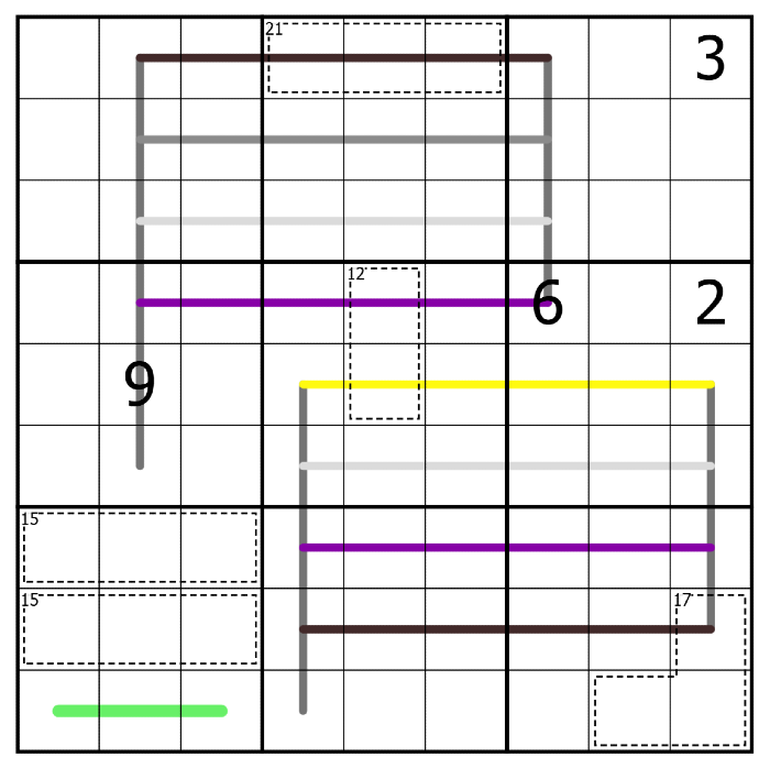 Hint 2: 3 must go in the 15 cage in row 8. Similarly, 2 must go in the 15 cage in row 7. This forces 1 to be on the German whisper line. The German whisper must also sum to 15 because the whole box must sum to 45, and knowing a 1 is on it tells you what its digits must be, and in turn tells you the rest of the cages.