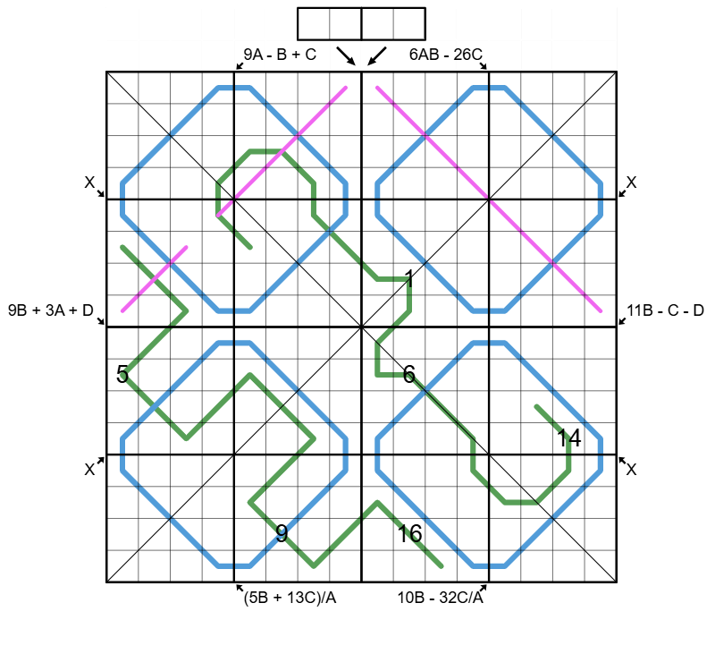 • Blue lines are Region Sum lines and are divided into segments by region borders where each segment has the same sum. Different lines may have different sums.