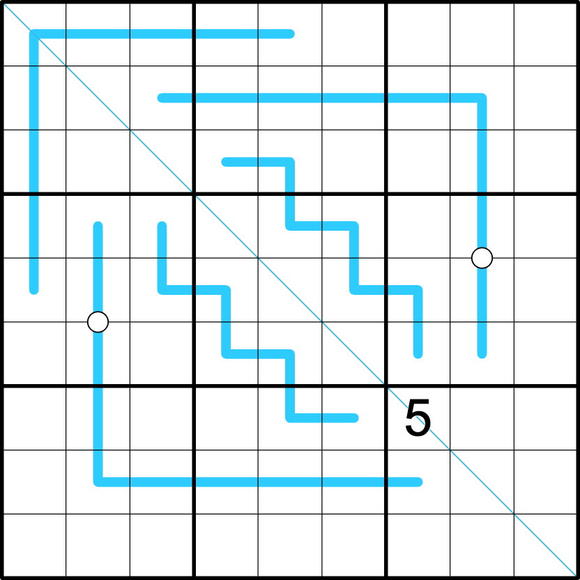 Region Sum: Blue lines are segmented by box borders. Each segment along a blue line must have the same sum.
