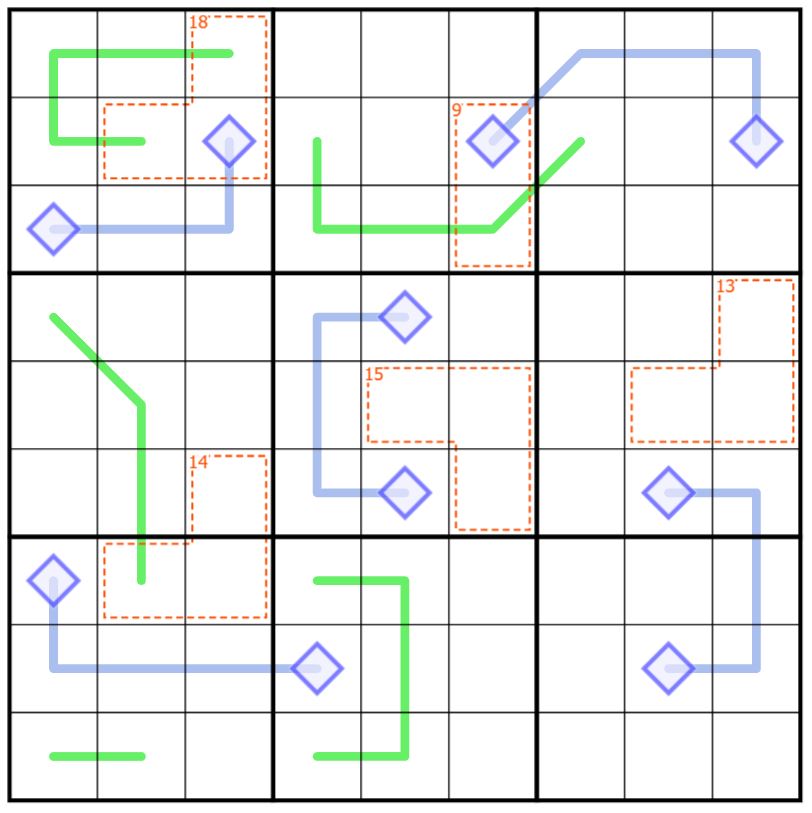 #4 Lines with diamonds at either end are Lockout Lines. Digits on a Lockout Line cannot be between or equal to the digits in the diamonds at the ends of their line. The digits in the diamonds at the ends of a line must differ by at least 4.
