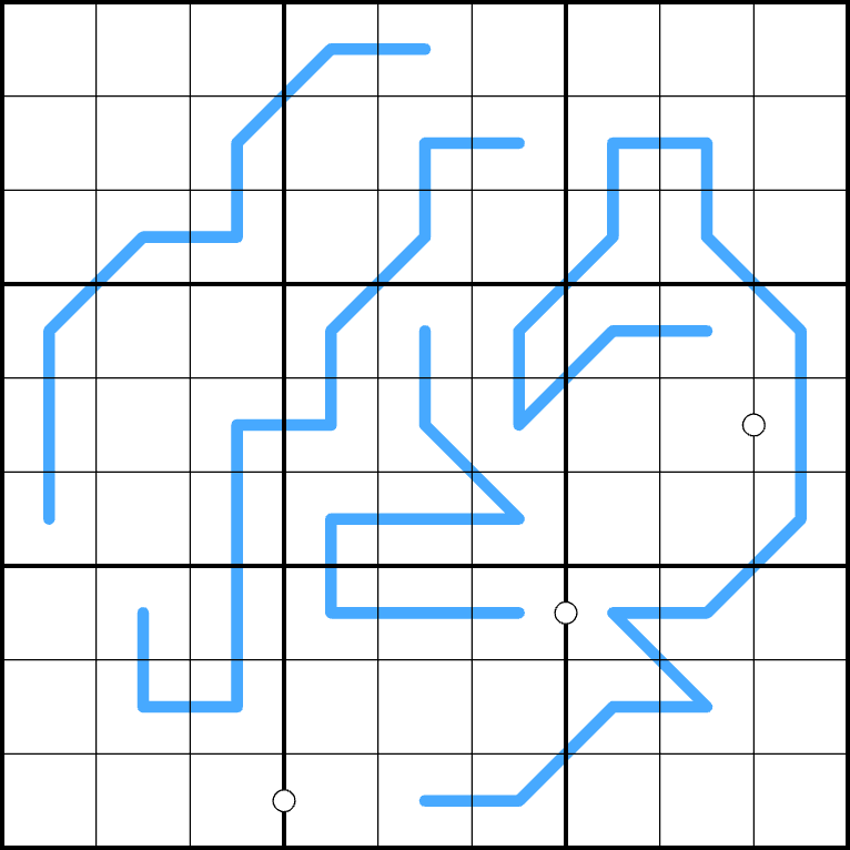 Weiße Punkte verbinden aufeinanderfolgende Ziffern. Nicht alle möglichen weißen Punkte sind vorgegeben.