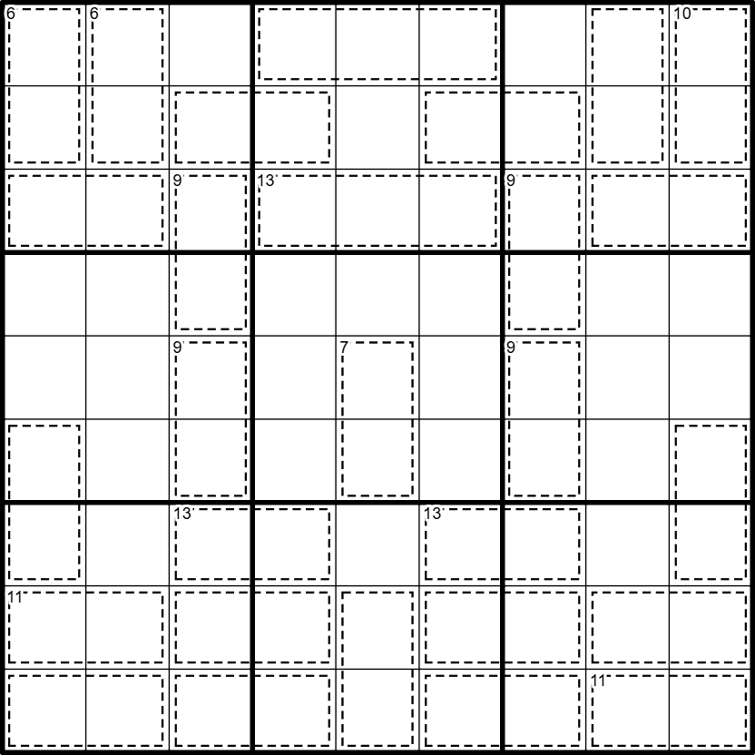 - Unique Killer Cages: Within a cage, digits don't repeat and they must sum to the small number written in the top left of that cage. Additionally no digit may be used more than once among all the cages of the same sum, even if that sum is not explicitly given.