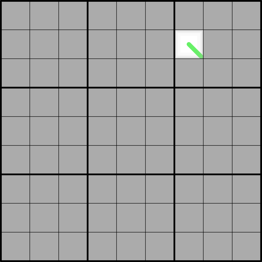 Each end of a whisper line points towards a cell. The digit at each end of a Whisper line is placed N cells away from the other end (In the pointed direction), where N is the digit at the other end of the line.
