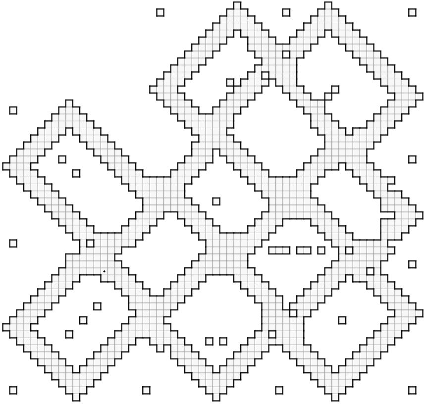 Solution code: left to right for row 29 (the one that includes the solitary cell in the middle of the grid),
