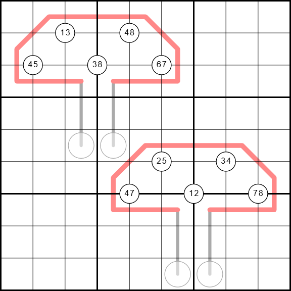 - Digits on gray between lines must be between the digits in the attached circles (between lines continue uninterrupted underneath red lines).