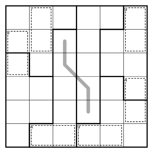 Irregular Sudoku rules apply. Place the digits 1 - 6 once in every row, column and bold outlined region.