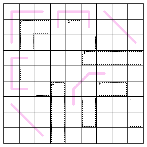 - Renban-Linien: Jede rosa Linie enthält eine Menge aufeinander folgender, sich nicht wiederholender Ziffern in beliebiger Reihenfolge.