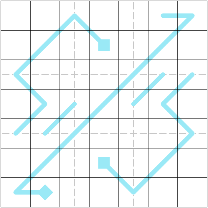 Squishdoku: Normal Squishdoku rules apply; place the digits 1-9 at most once in every row, column, and 3x3 box. There are nine 3x3 boxes, which overlap at the dashed lines.