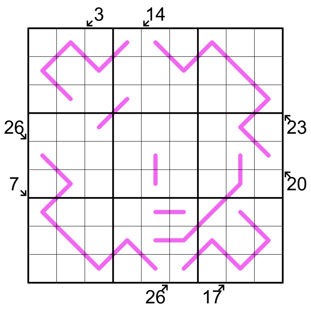 Purple lines must contain non-repeating consecutive numbers in any order.