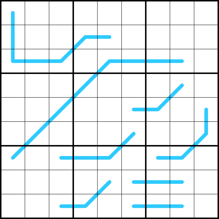 Anti-King sudoku rules apply (i.e. no 2x2 region may contain repeated digits). Box borders divide blue lines into segments with the same sum.