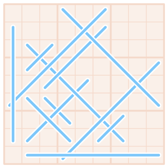 3x3 box borders divide a blue stick into segments. Each segment along a stick has the same sum. This segment sum can be different for different sticks.