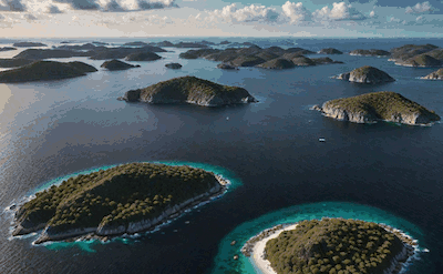The islands are surrounded by a waterway -- a single orthogonally connected group of cells. All caged cells are waterway cells; the digit in a caged cell indicates how many waterway cells are seen orthogonally from that position, including itself (island cells block vision). The waterway cannot form any 2x2 areas.
