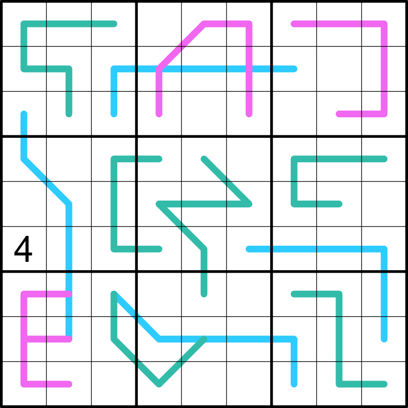 4. Each set of 3 digits along a teal line must be from a different set of (1,4,7), (2,5,8), and (3,6,9)
