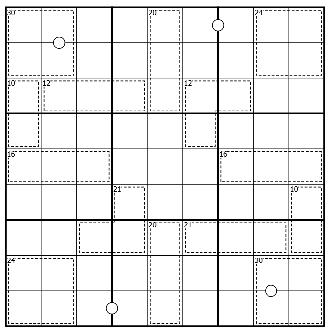 - No two cages of the same type (sum cage or product cage) with the same given number exist. E.g. if one 15 cage is a sum cage, then the other is a product cage