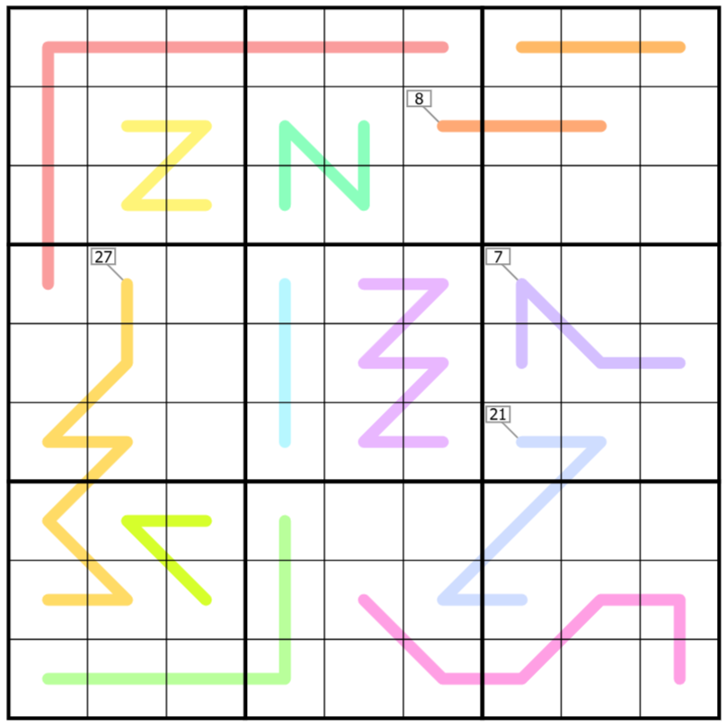 - Product Sum Lines: Digits may not repeat on a line. On each line, the product of the shaded cells must be equal to the sum of the unshaded cells, and if a tag is attached to the line, they must both be equal to the number on the tag. Differently colored lines are purely cosmetic.