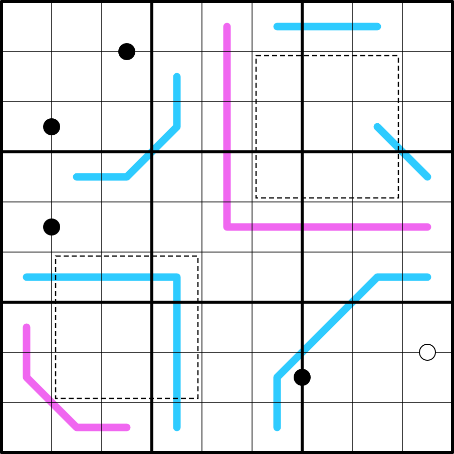 Region Sum Lines: blue lines are split into segments by box borders. Segments on the same line sum to the same total. Different lines can have different totals.