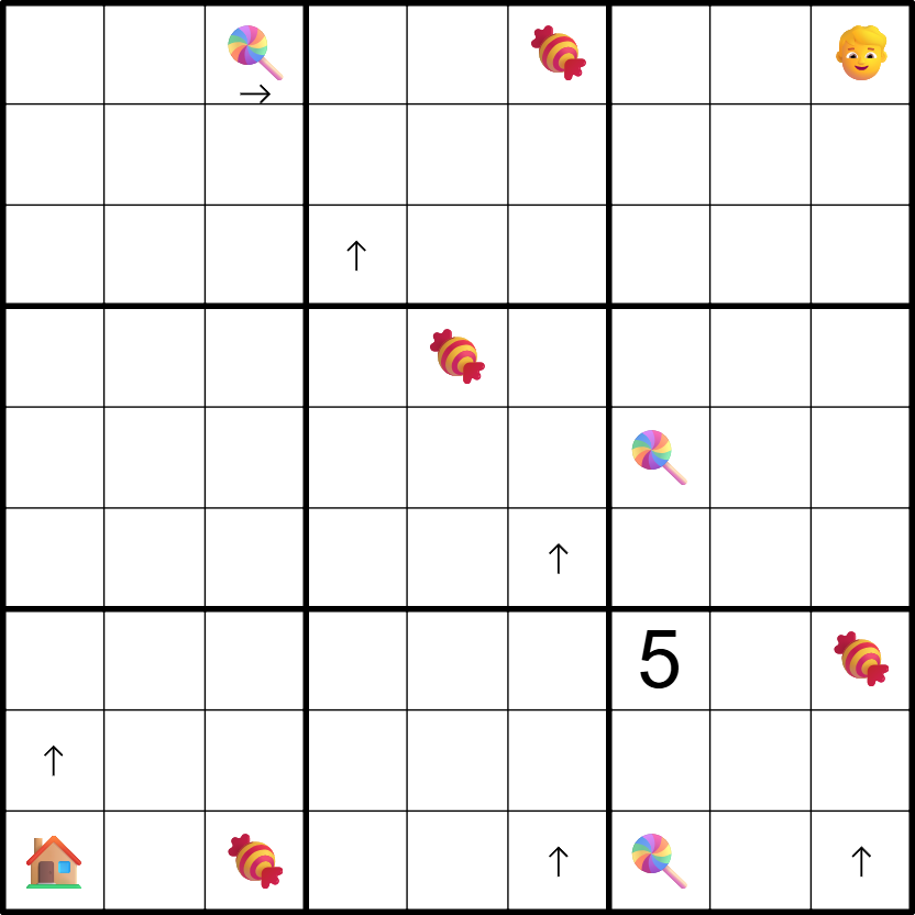 The boi in the top right of the grid travels through the grid to the house moving orthogonally between the centres of some cells and does NOT branch or visit the same cell more than once. Each sweet has a different digit from