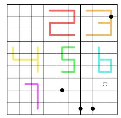 Digits separated by a black dot are in a 1:2 ratio. Digits separated by a white dot have a difference of 1.