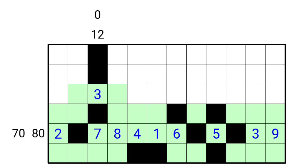 Example: Here is a more detailed example. In column 3, the first segment has no digit, so the sum is 0. The second segment 12=3*2^2. In row 5, the first segment 70=7*2^2+8+4*2+1*2+6*2^2 and the second segment 80=5*2^4.