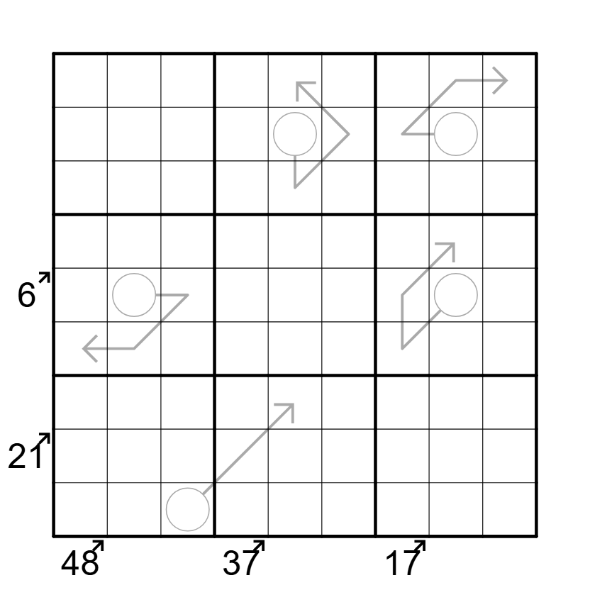 Little Killer: Digits along the marked diagonals sum to the number on the outside.