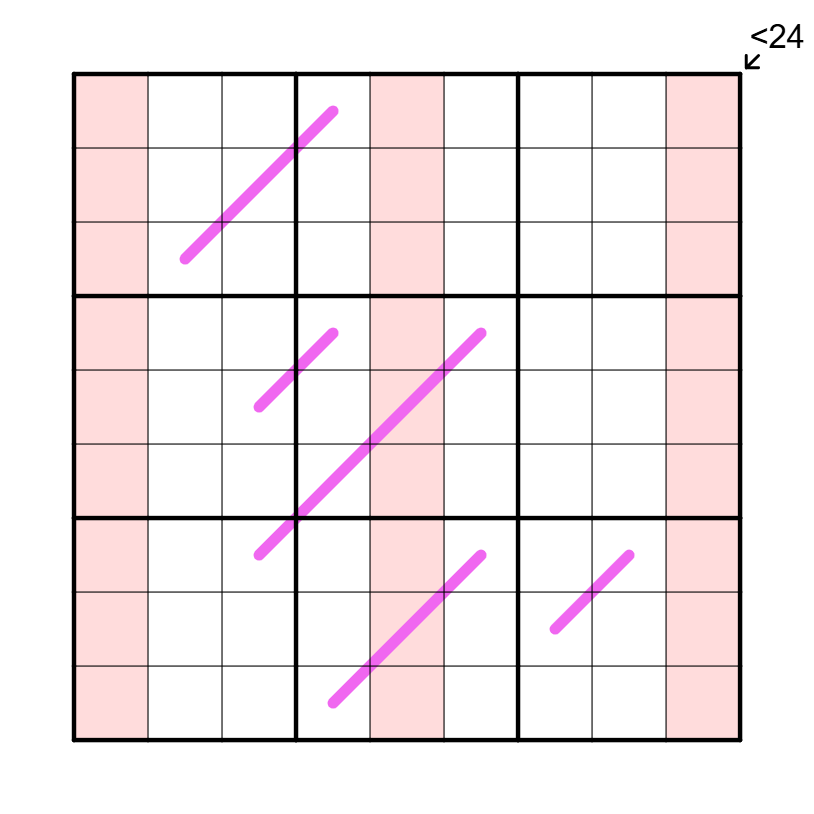 Little Killer: Digits along the positive diagonal sum to a value that is (strictly) less than 24.