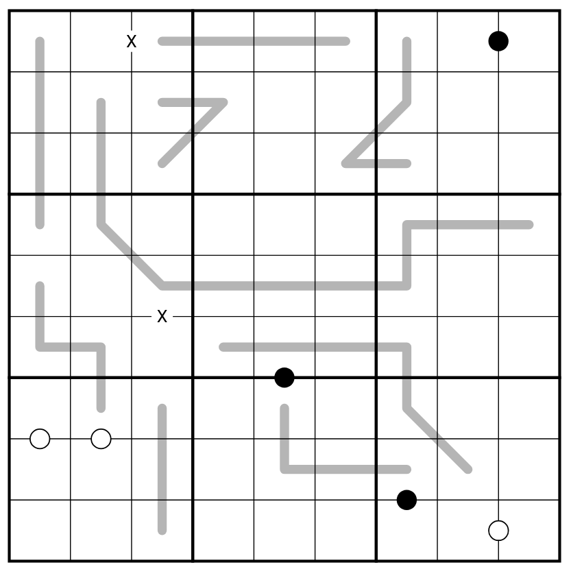 X-Pairs. Cells separated by a "X" must sum to 10. Not all X-pairs are given.