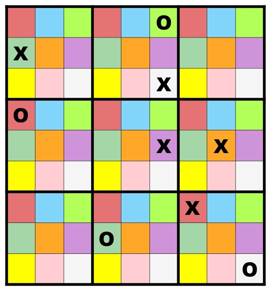 Complete the grid so that each of the nine 3x3 squares, and each 3x3 square formed from cells of the same colour, contain a drawn game of noughts and crosses (no row, column or diagonal contains three noughts or three crosses).