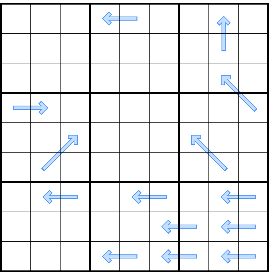 Clarification: Arrows have the box number on its base, and the position number on its tip. For example, if an arrow has the digits 6→3 then the cell r4c9 has the digit 9, since the 6th box in western reading order is center right, and the 3rd position (also in western reading order) is Top Right.