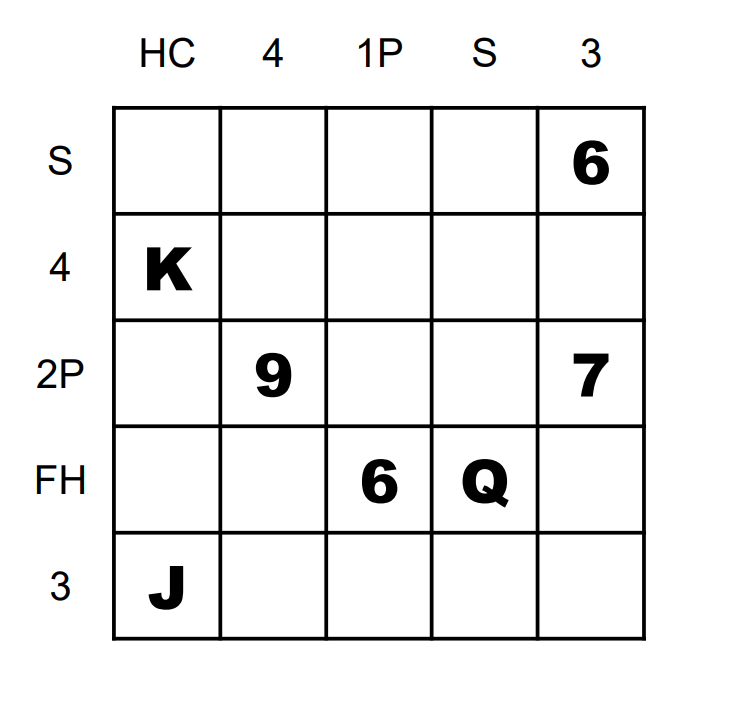 Each row and column contains a poker hand drawn from a single pack of playing cards (suits ignored). Find the missing cards.
