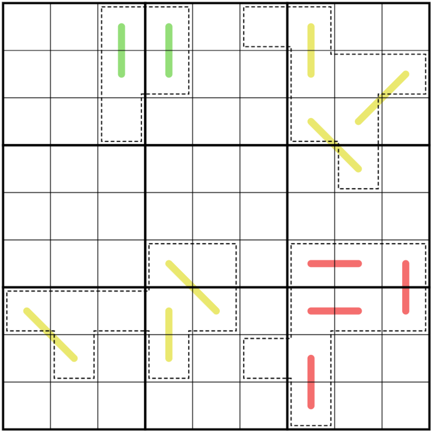 - Coordinate Arrows - The sum of two digits along an arrow must equal the digit in the cell at row X, column Y where X is the first digit on the arrow and Y the second (arrow tip). No two arrows reference the same coordinate. However, I've been a bit silly and lost the tips of the arrows so they're just lines now. Whoops!