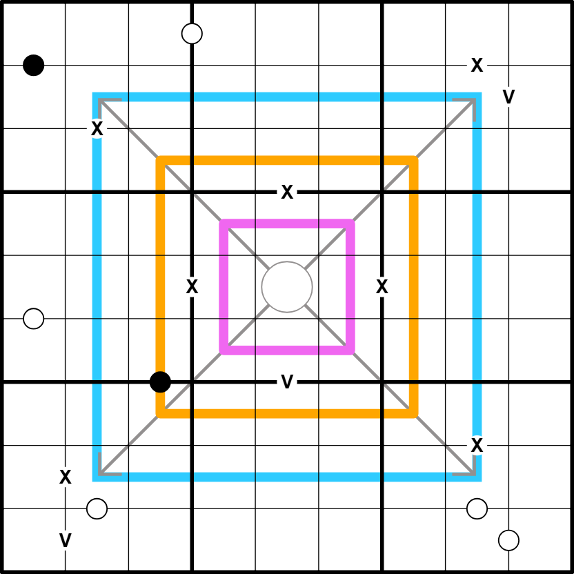 Not all Xs, Vs or dots are given.