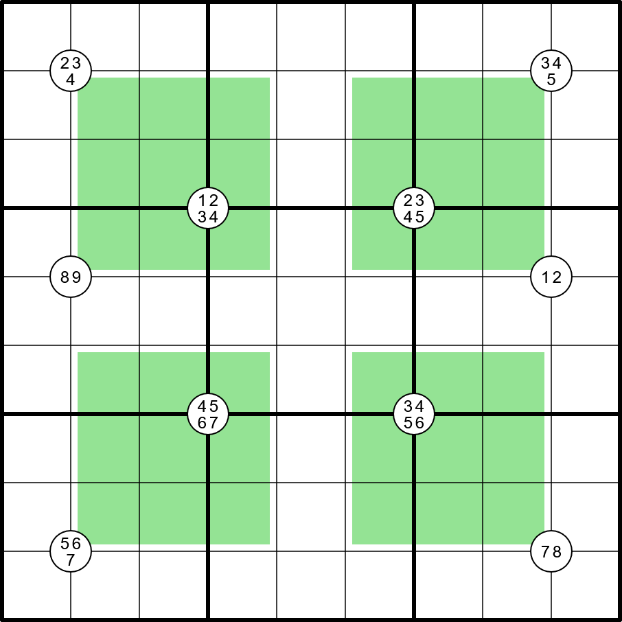 There are four additional regions marked in green. Each also contains the digits 1 through 9.