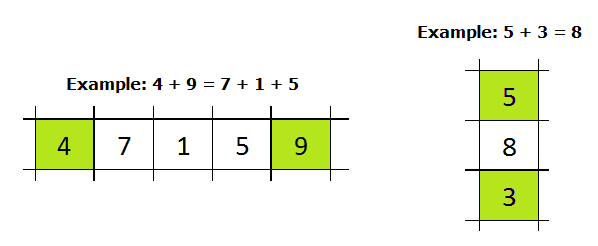 - In jeder Zeile und jeder Spalte mit zwei gefärbten Zellen muss die Summe der beiden Ziffern in diesen gefärbten Zellen gleich der Summe der Ziffern dazwischen sein.