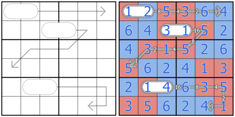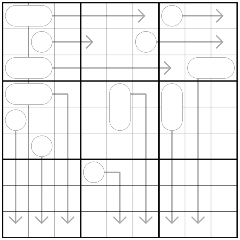 3. Arrows are NOT normal arrows, but contain "binary sums". Each cell along the arrow is a bit, starting with the most significant bit and going to the least significant. If a cells contents are odd, that put a 1 in that bit, and if a cells contents are even, that puts a zero in that bit. The digits in the bulb of the arrow are that sum expressed as a one or two-digit decimal number read from left-to- right or top-to-bottom.