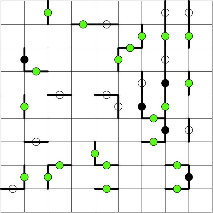 Region border dots: All black, white, and green dots lie between cells in different regions. The border is marked.