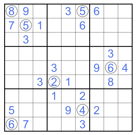 Ein Kreis bedeutet, daß die beinhaltete Ziffer den arithmetischen Durchschnitt aller Ziffern aufweist, die in orthogonal benachbarten Feldern stehen.